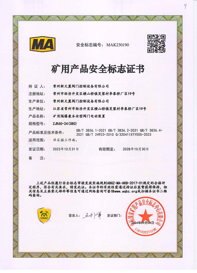 礦用產品安全標志證書ZJK180-24(380)